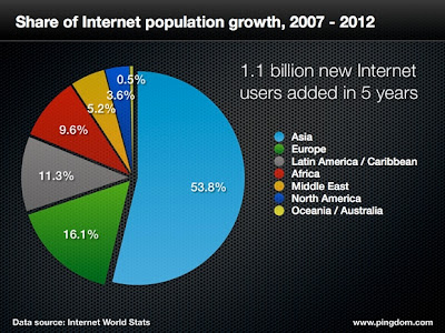 El siguiente gráfico muestra que la población de Internet en Asia es ahora casi tan grande como toda la Internet hace 5 años,